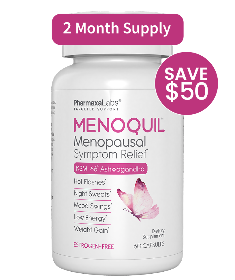 Menoquil is powered by a synergistic blend of clinically researched ingredients, including Black Cohosh to ease hot flashes and support hormonal balance, KSM-66® Ashwagandha to promote stress resilience and emotional well-being, Grape Seed Extract to protect from oxidative stress, and Soy Isoflavones to naturally support estrogen balance. Together, these and the additional targeted extracts in the blend provide comprehensive, effective support for women at every stage of menopause. Click here to learn more about the advanced Menoquil formula.